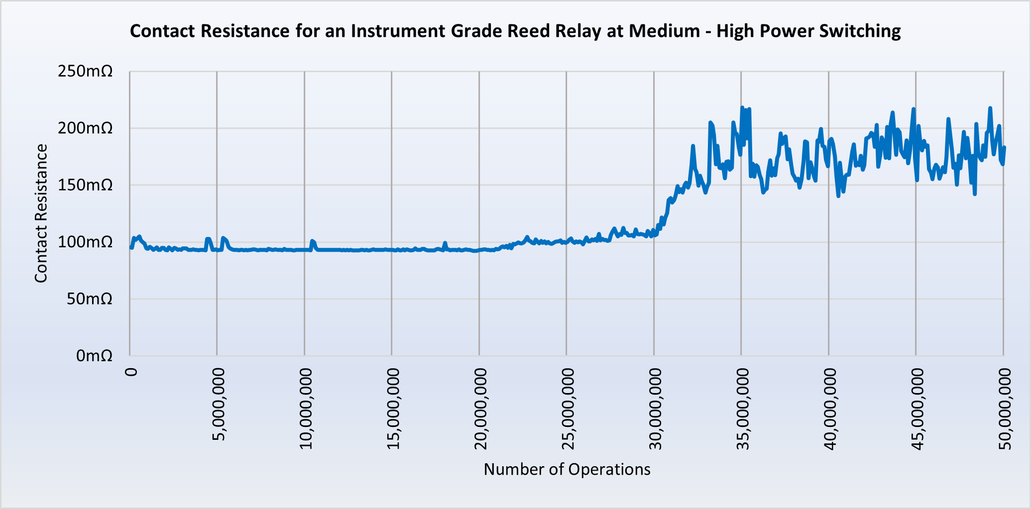 As mentioned, a reed relay can perform billions of operations. This is particularly the case when ‘cold switching’ or switching low power. But even so, it will eventually reach its EOL. This is nearly always because the contact resistance (CR) of the switch has increased to such an extent that it is no longer suitable for the application.